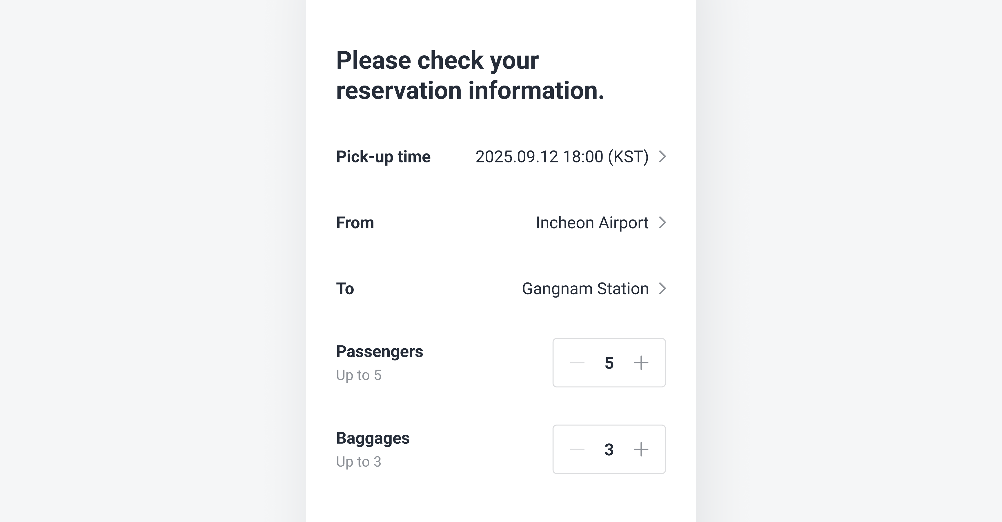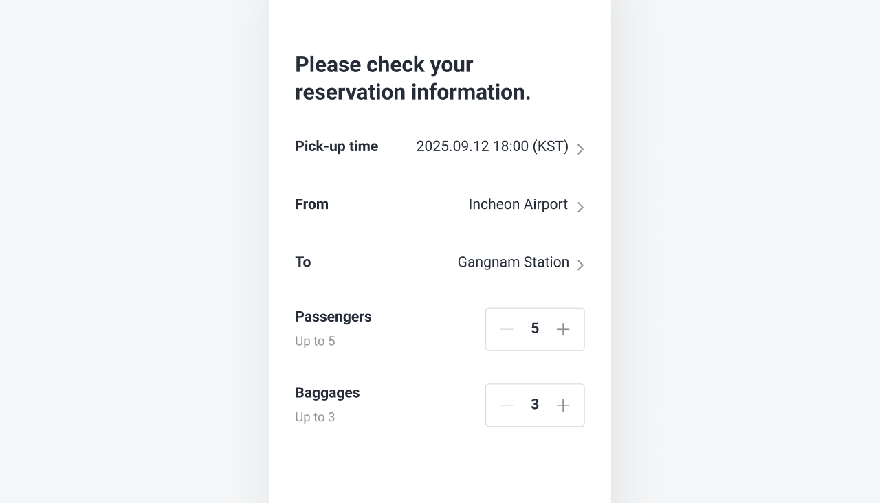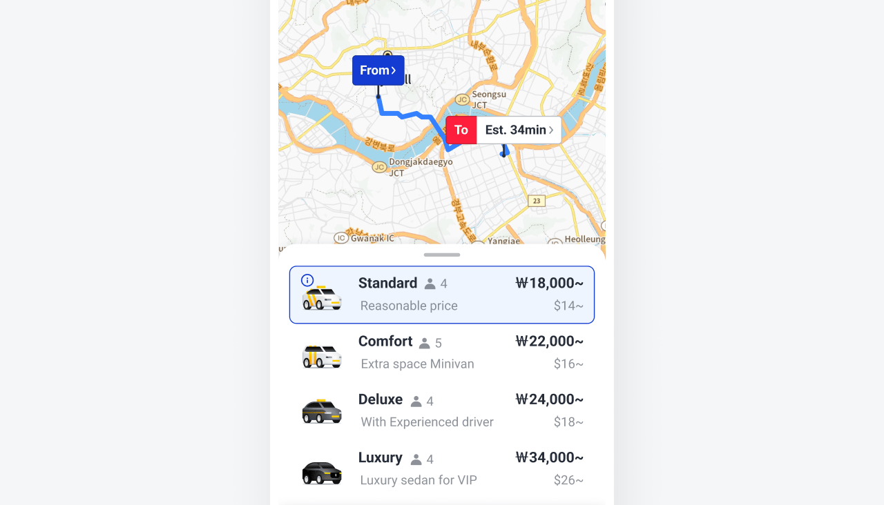 차량을 호출하기 전에 예상 요금을 미리 확인할 수 있어요. 정직하고 합리적인 요금으로 안심하고 택시를 부르세요.